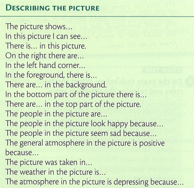 Keďže prázdninové fotografie majú podobné témy, môžeme ich použiť aj ako prípravu k ústnej časti maturitnej skúšky Popis obrázka (popis, porovnanie a zážitky a skúsenosti). Uvádzame tu pomocné modelové frázy pre popis obrázkov, ktoré sú súčasťou učebnice pre prípravu na maturitu Exam Activator.